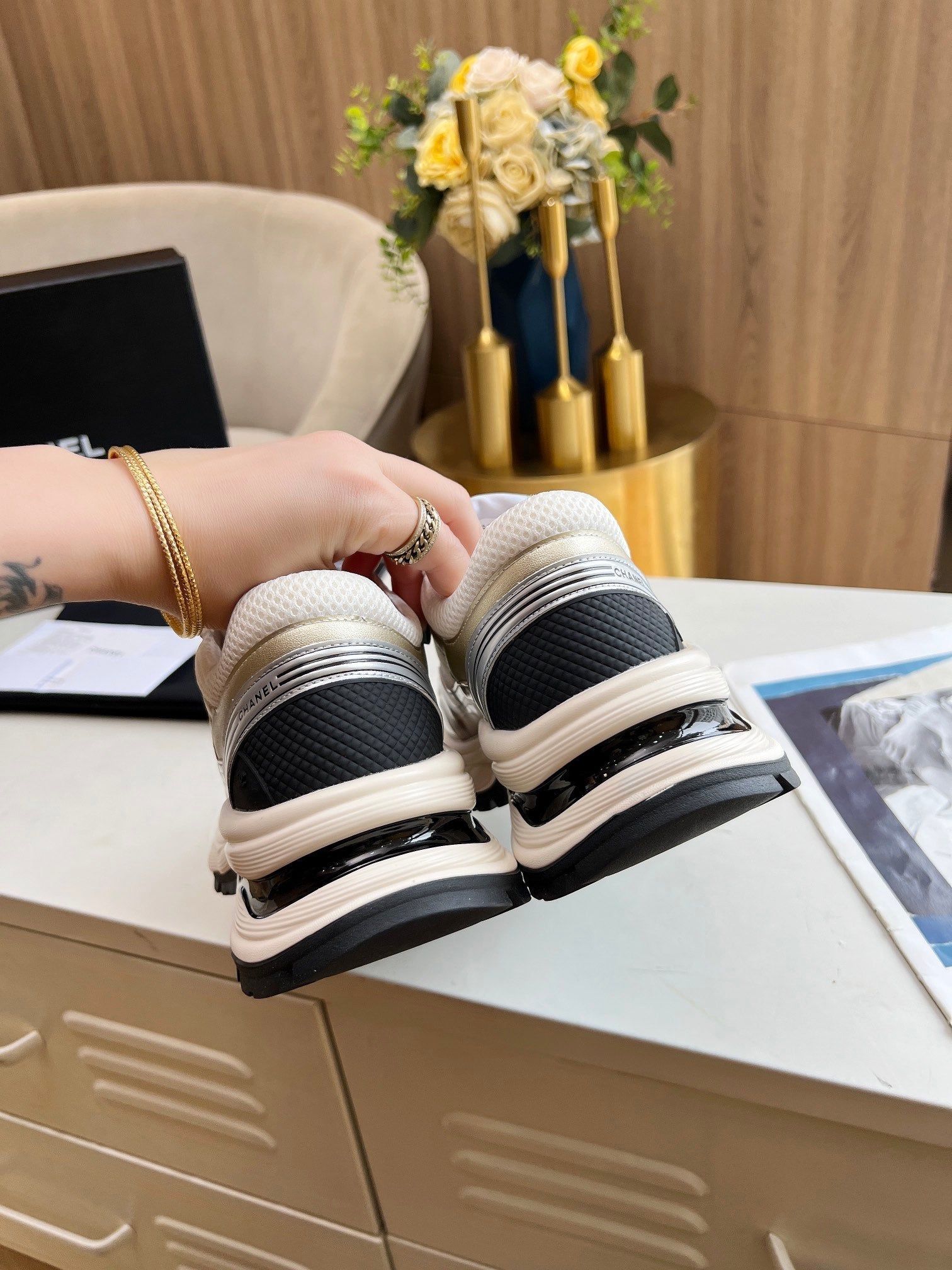 cc trainer black gold calfskin white mesh