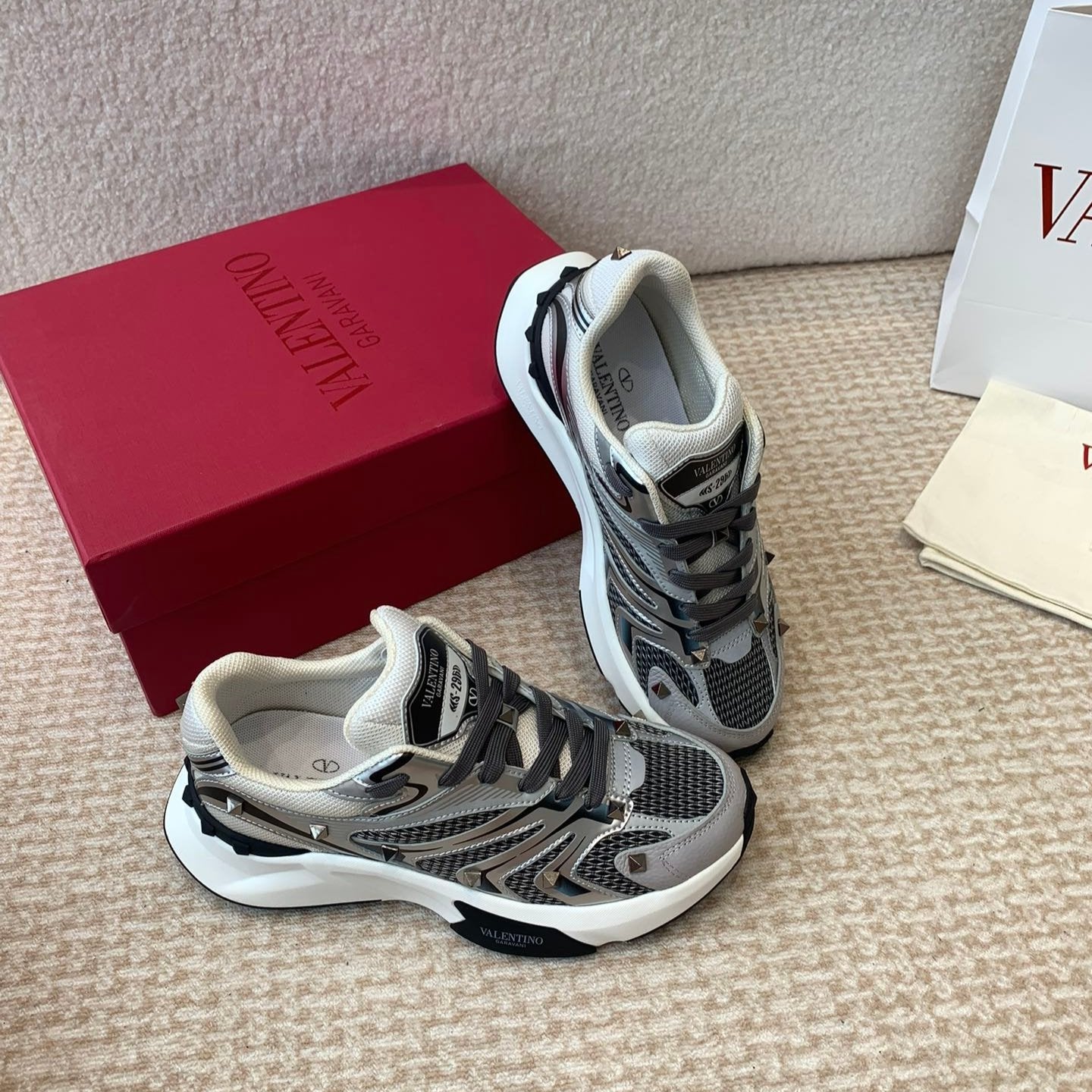 Valentino Sneaker 50mm In Black Mix Grey Blue Mesh Fabric And Cowhide 814272