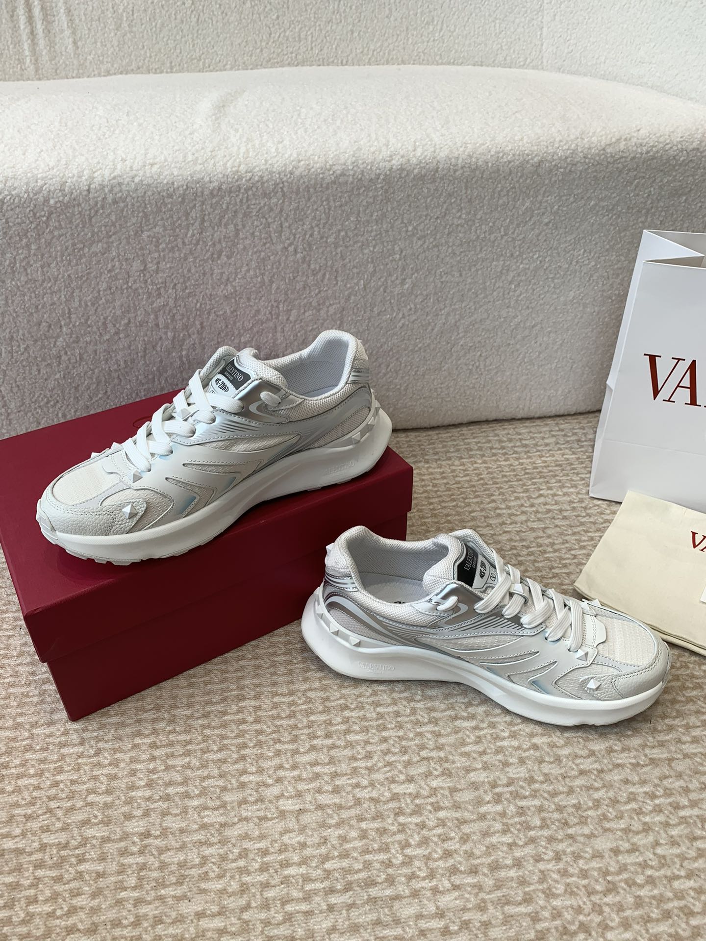 Valentino Sneaker 50mm In White Mix Grey Blue Mesh Fabric And Cowhide 814274