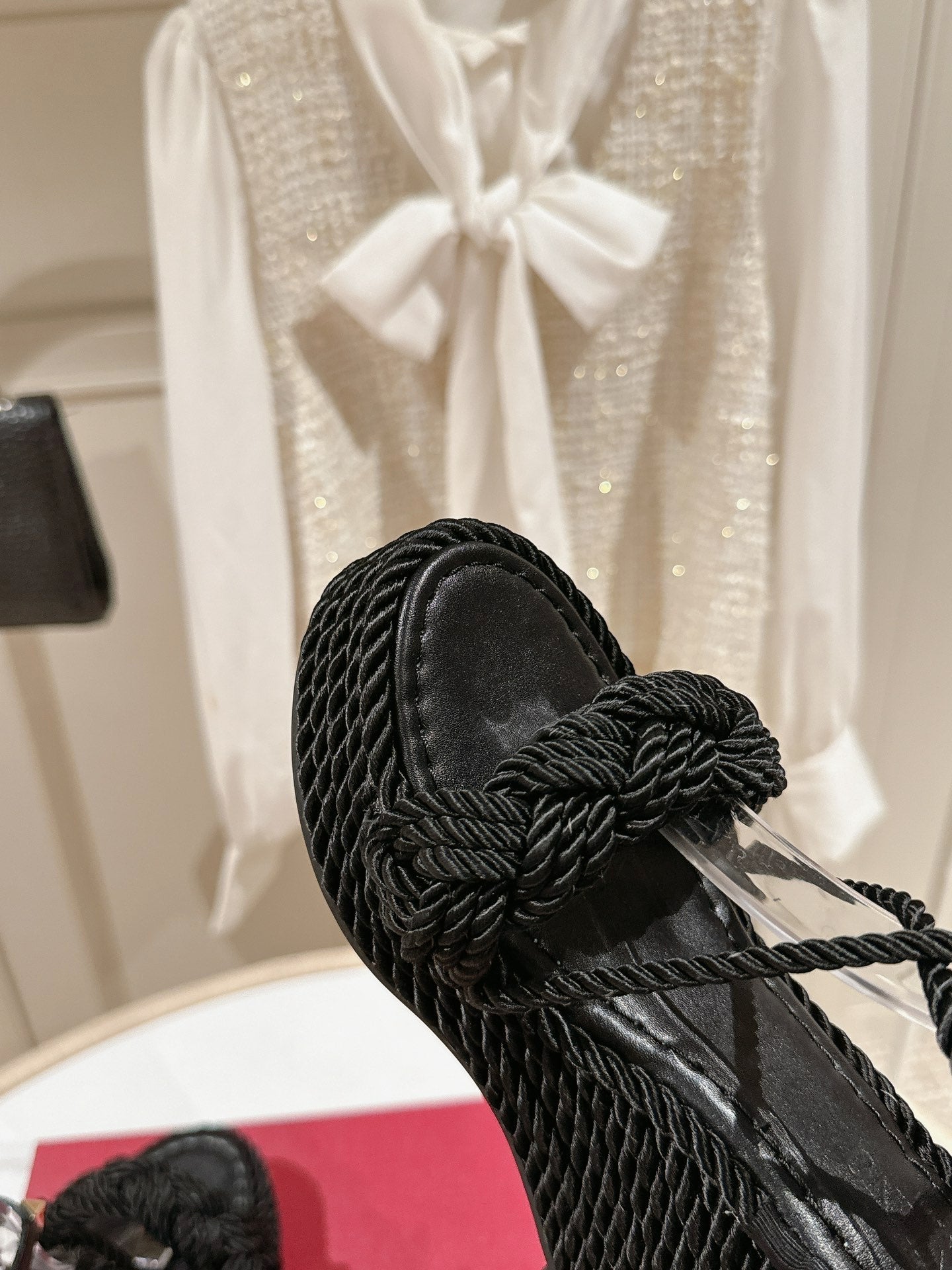 Garavani Rockstud Wedge Sandals 100mm In Black Calfskin And Nylon Rope 829395