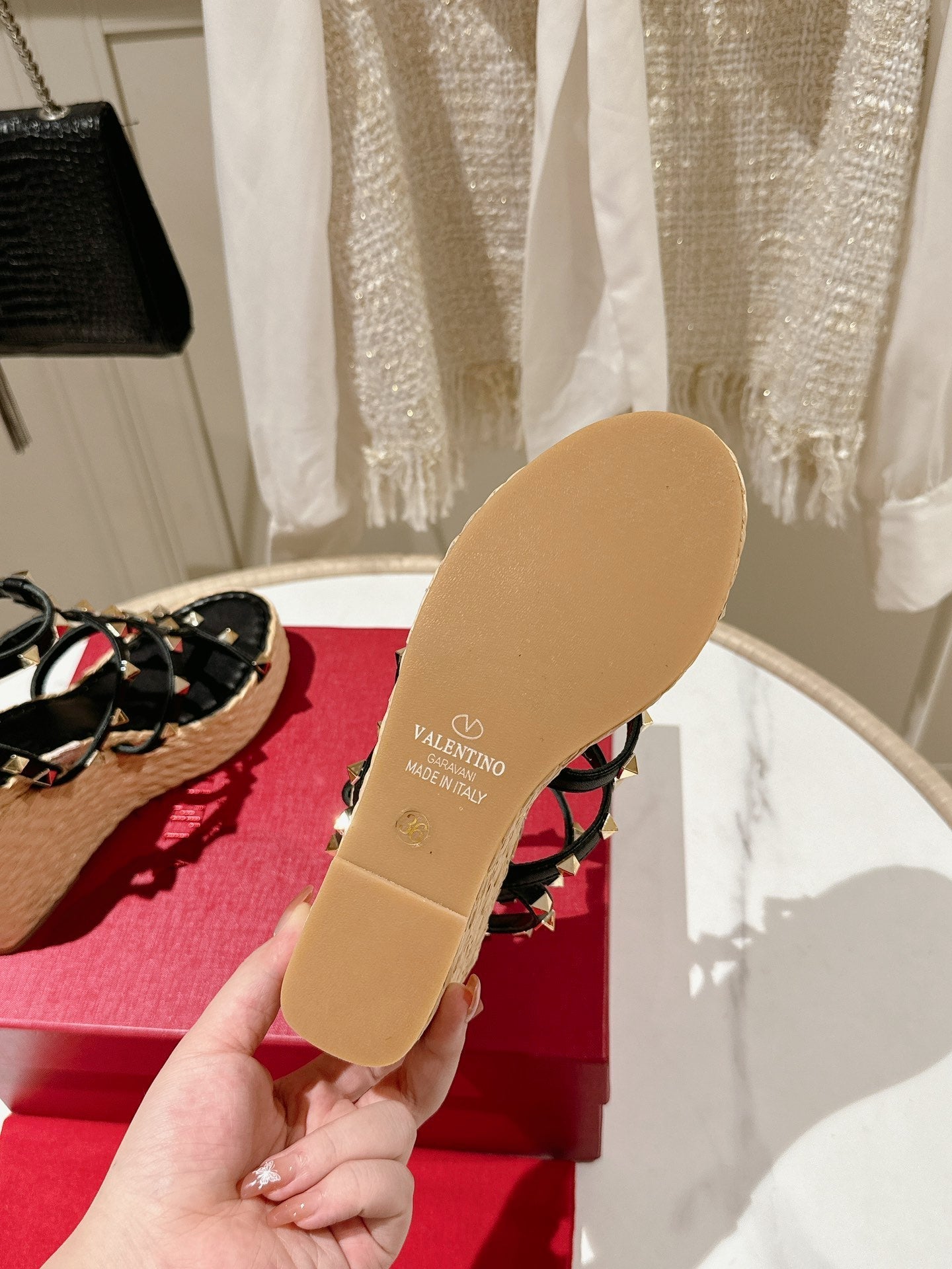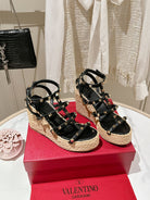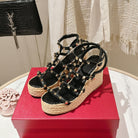 Rockstud Ankle Strap Wedge Sandal In Black Calfskin Leather And Beige Raffia 100mm 829389