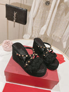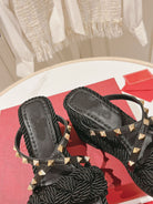Rockstud Wedge Sandal In Calfskin Leather Black 10cm
