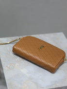 GABY ZIPPED POUCH 19 IN CARAMEL BROWN QUILTED LAMBSKIN GOLD HARDWARE