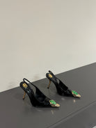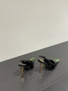 GREEN GEM-STUDDED SLINGBACK PUMPS IN BLACK PATENT CALFSKIN