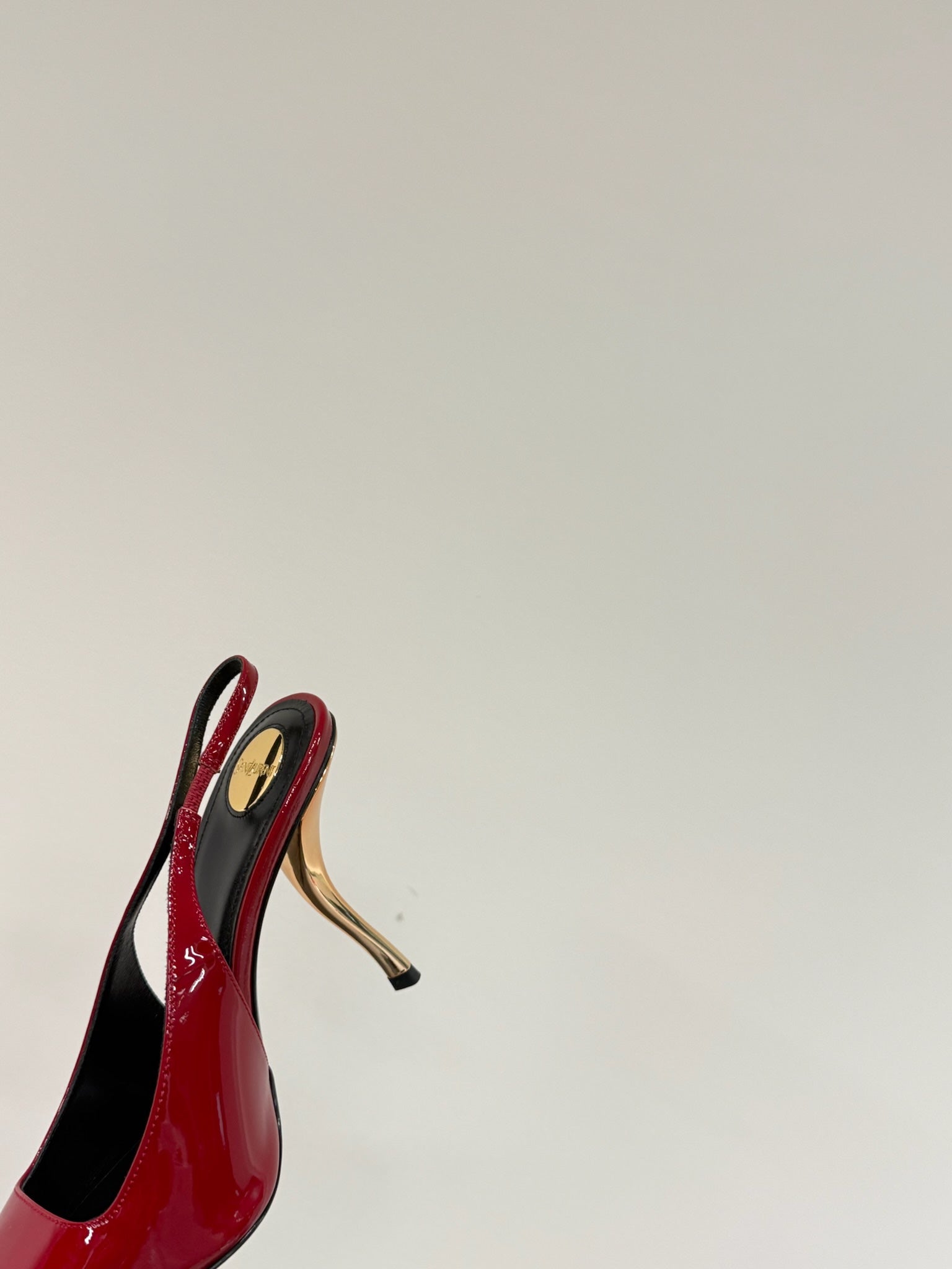 ORANGE GEM-STUDDED SLINGBACK PUMPS IN RED PATENT CALFSKIN