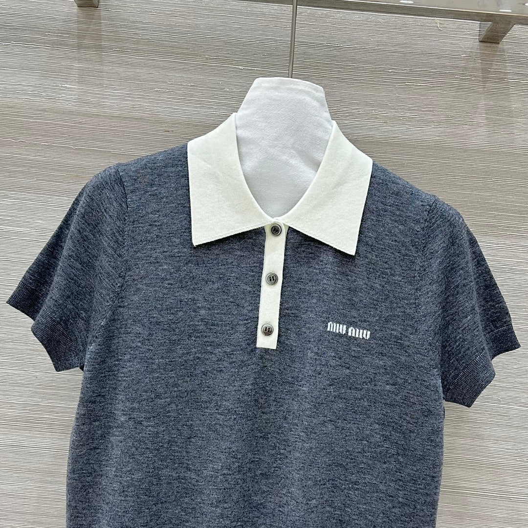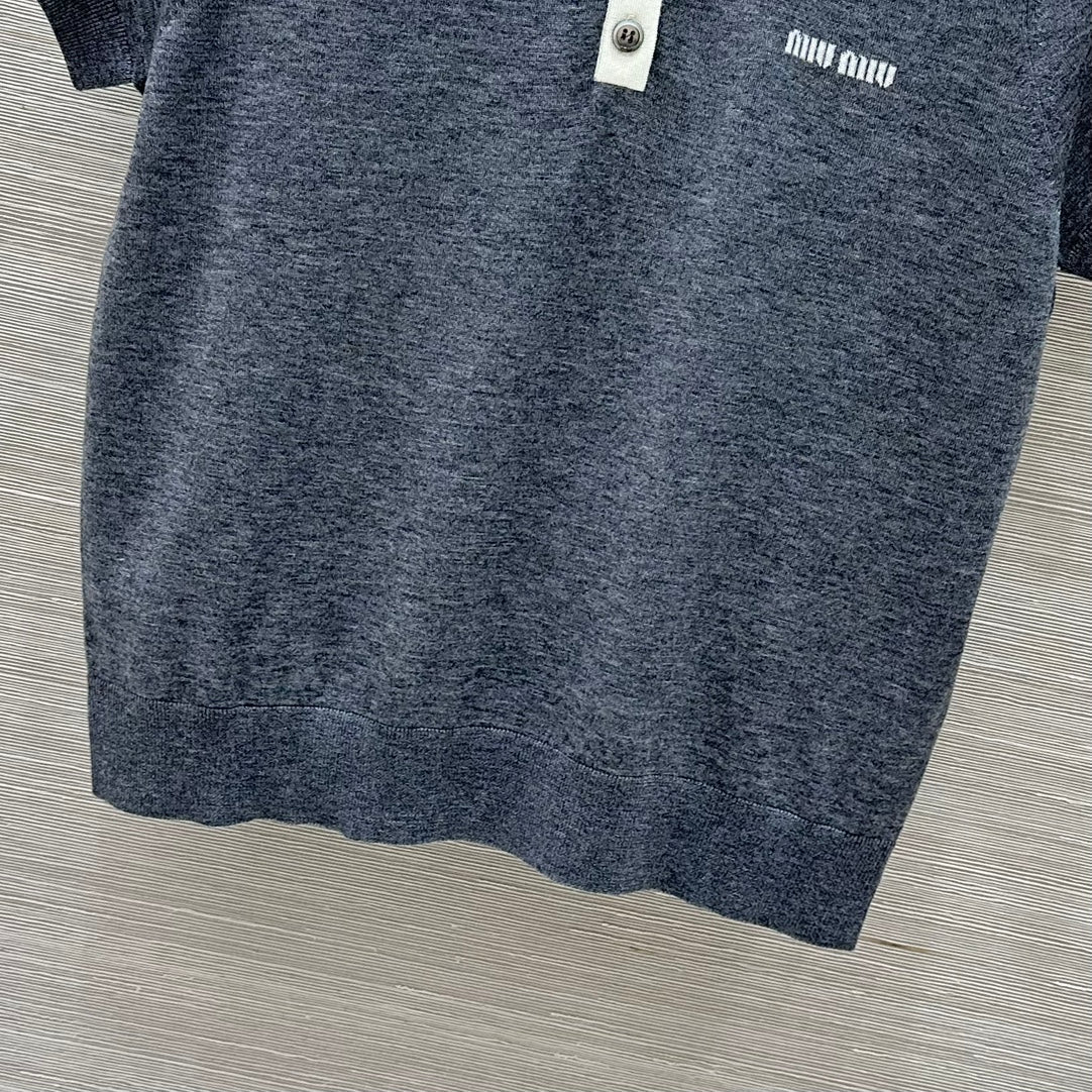 Miu Miu 25 Polo Collar Short-sleeve Knitted Top Gray Wool
