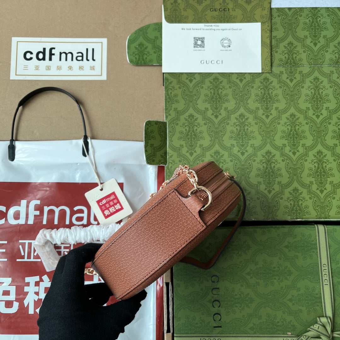 OPHIDIA MINI ROUND SHOULDER BAG 18 IN BLUSH PINK CANVAS AND BROWN LEATHER TRIM
